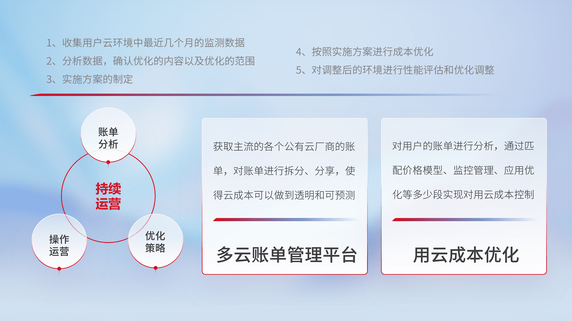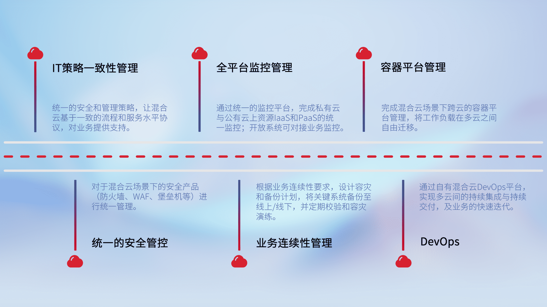 通过多云纳管,,以统一的资源数据模型把客户的云资源进行抽象和封装,,,进而实现对多云资源的统一操作,,,,保障云资源管理的可靠性、、、、稳定性与可用性。。。。量身定制化运维内容,,,配置、、、、开发运维、、、、补丁管理、、、备份、、、、监控、、认证和访问管理、、审计和日常巡检等,,,保障在用云过程中的可靠度,,稳定度以及高可用率。。。