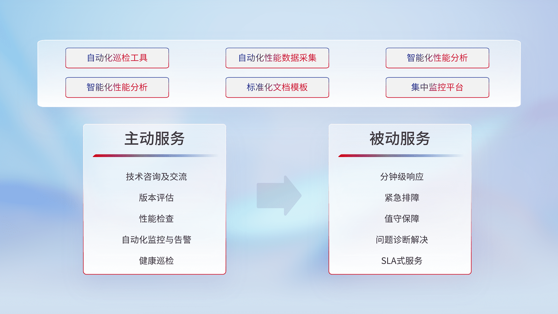 智能化工具和标准化文档,,,保障服务质量,,,提供主动服务(包含技术咨询、、、版本评估、、性能检查、、自动化监控与告警、、、健康巡检)和被动服务包含(分钟级响应、、、紧急排障、、、、值守保障、、、问题诊断解决、、、SLA服务)。。。